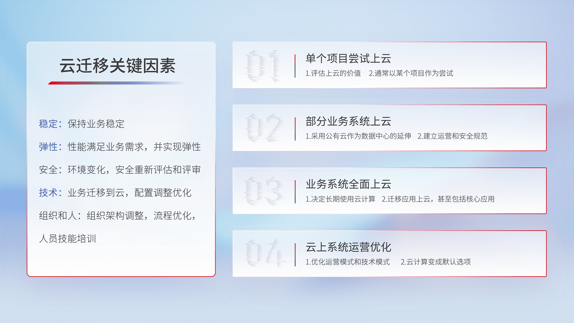 结合实际业务,,从规划设计、、云平台选型、、、、云原生改造、、、、数据迁移、、、集成交付,,,迁移全过程为客户识别最佳上云路径,,,做好风险识别管理,,设计网络架构、、、身份权限、、安全审计合规、、操作审计、、、日志审计、、监控告警策略、、多站点容灾设计等,,,对云上基础设施进行整体规划,,,提升IT治理水平,,,,以满足弹性、、、高可用、、、、高性能的需求。。。。