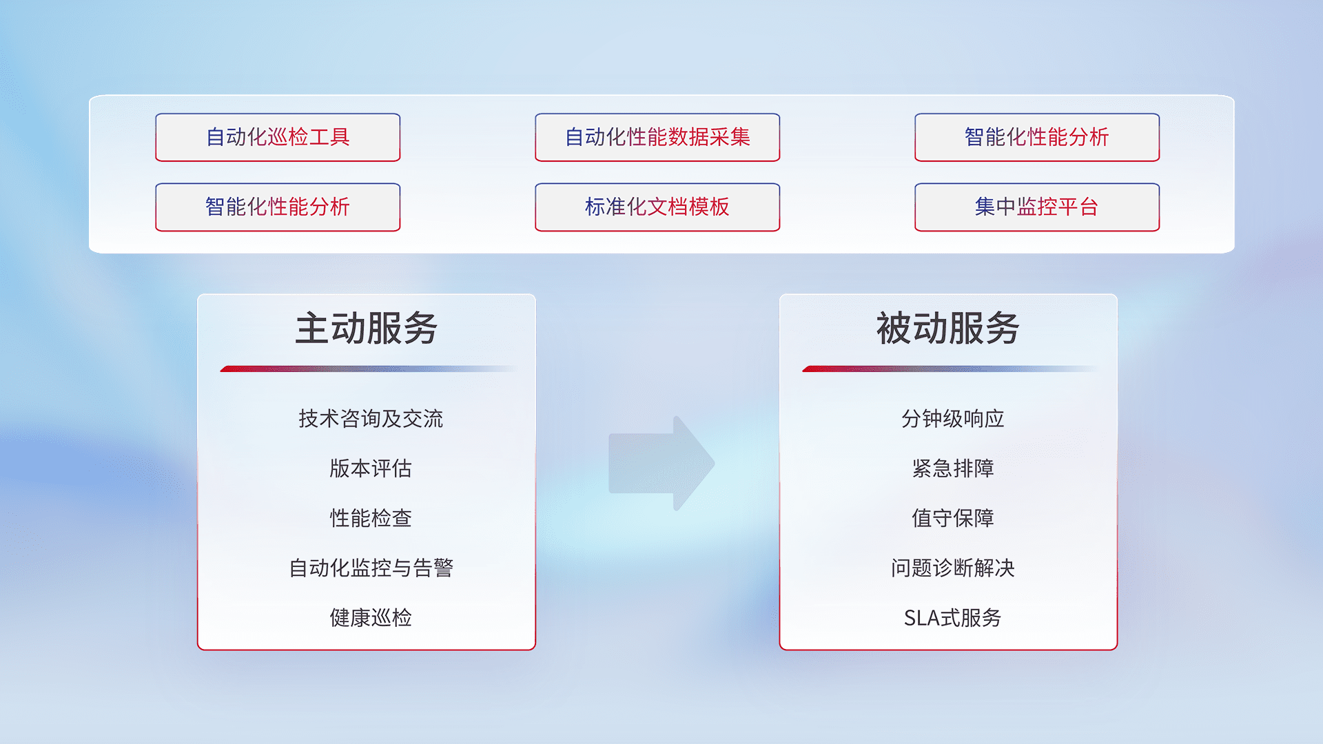 智能化工具和标准化文档,,,保障服务质量,,,,提供主动服务(包含技术咨询、、版本评估、、性能检查、、自动化监控与告警、、、、健康巡检)和被动服务包含(分钟级响应、、、、紧急排障、、值守保障、、、问题诊断解决、、、SLA服务)。。。